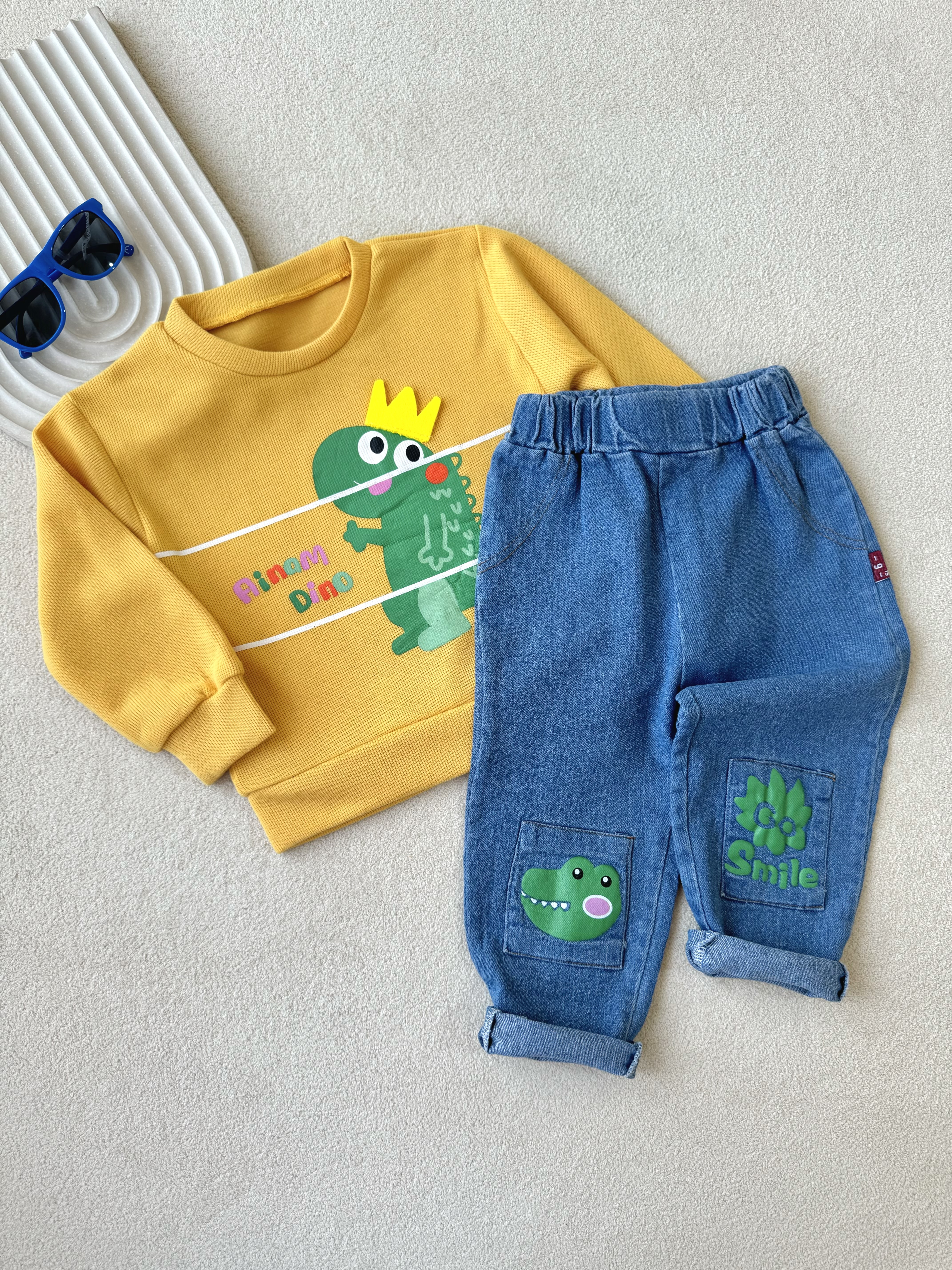 ست دوتیکه دورس و شلوار لی پسرانه سرمه ای طرح دایناسور وارداتی مناسب ۲ تا ۶ سال
