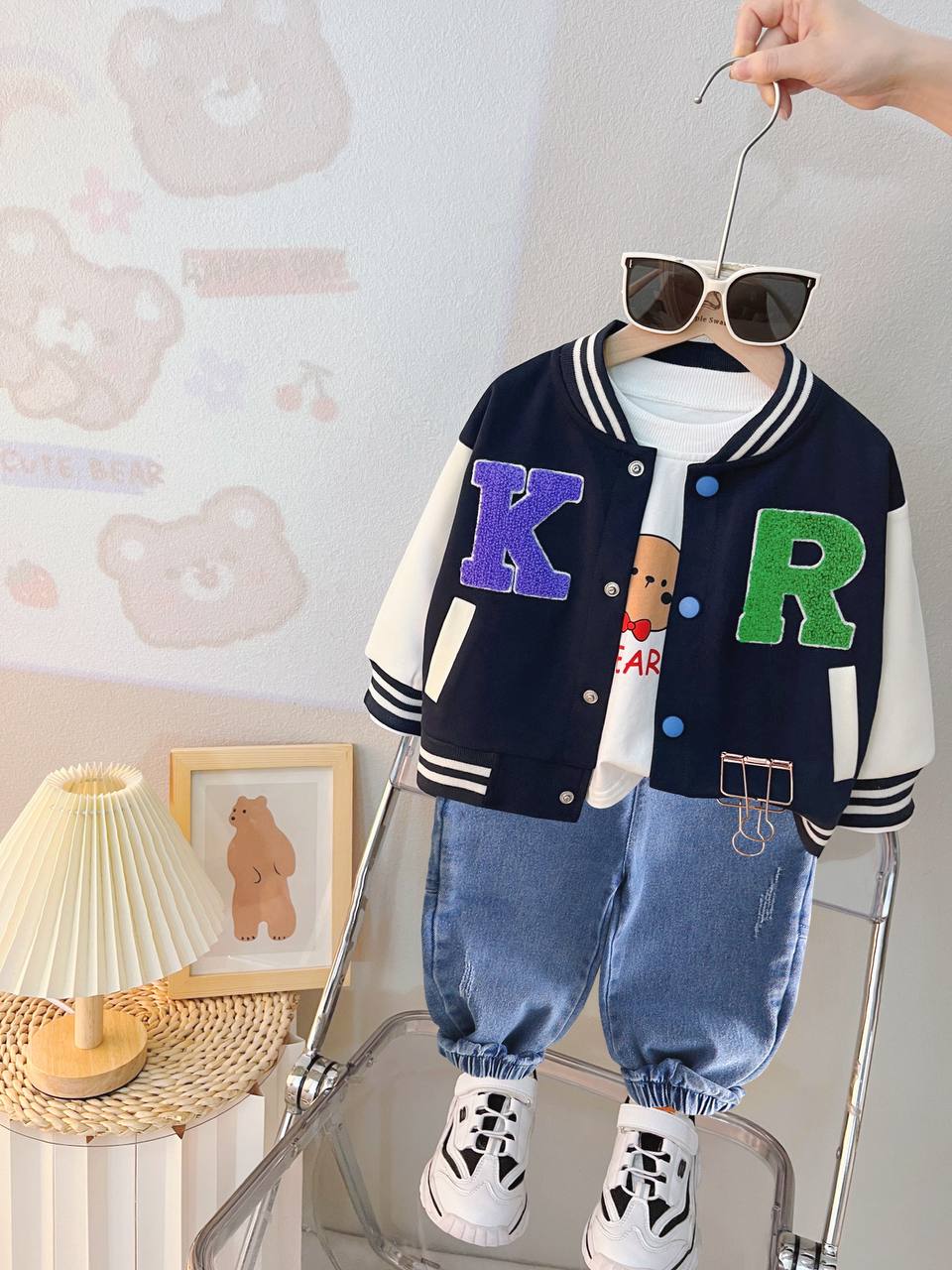 ست سه تیکه با کیفیت با ژاکت کرمی و شلوار لی پسرانه وارداتی مناسب 1.5 تا 5 سال