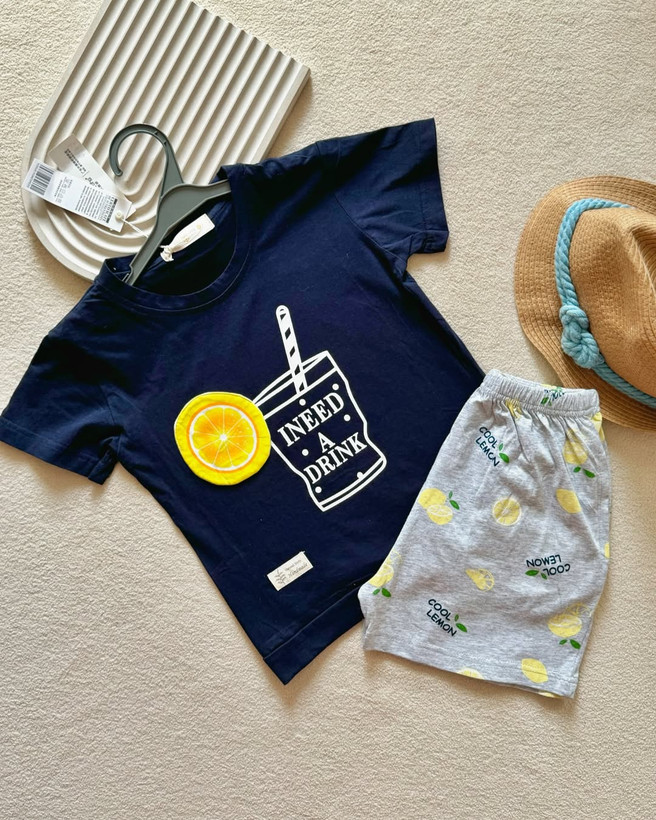 ست راحتی تابستانی بچگانه نخی وارداتی طرح لیمو برجسته مناسب (5 تا 8 سال)