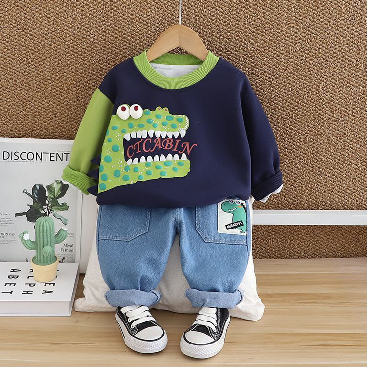 ست دوتیکه دورس و شلوار لی پسرانه سرمه ای طرح دایناسور وارداتی مناسب ۲ تا ۶ سال